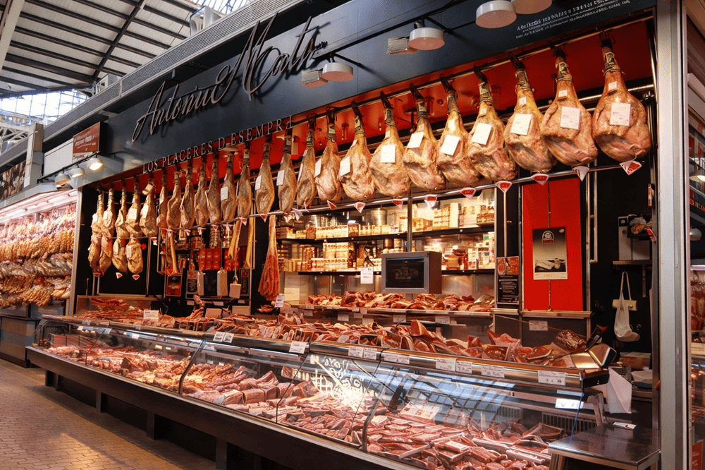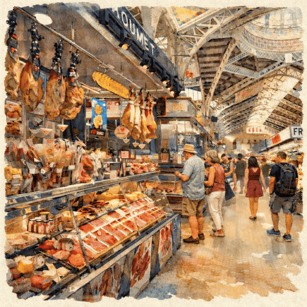 観光地として有名でありながら、ここは今も地元の人が毎日の買い物に訪れる“現役の市場”。朝になると近所の人々がかごを手に集まり、八百屋で果物を選び、精肉店で生ハムを買い、魚屋ではその日の一番良い魚を確かめています。