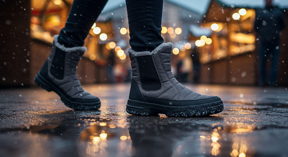 防滑ソール付きのウォーキングシューズやショートブーツなら安心です。撥水加工が施された素材を選べば、小雨や雪の日も対応可能。さらに中敷きに防寒インソールを入れると、足先の冷えを防ぎます。